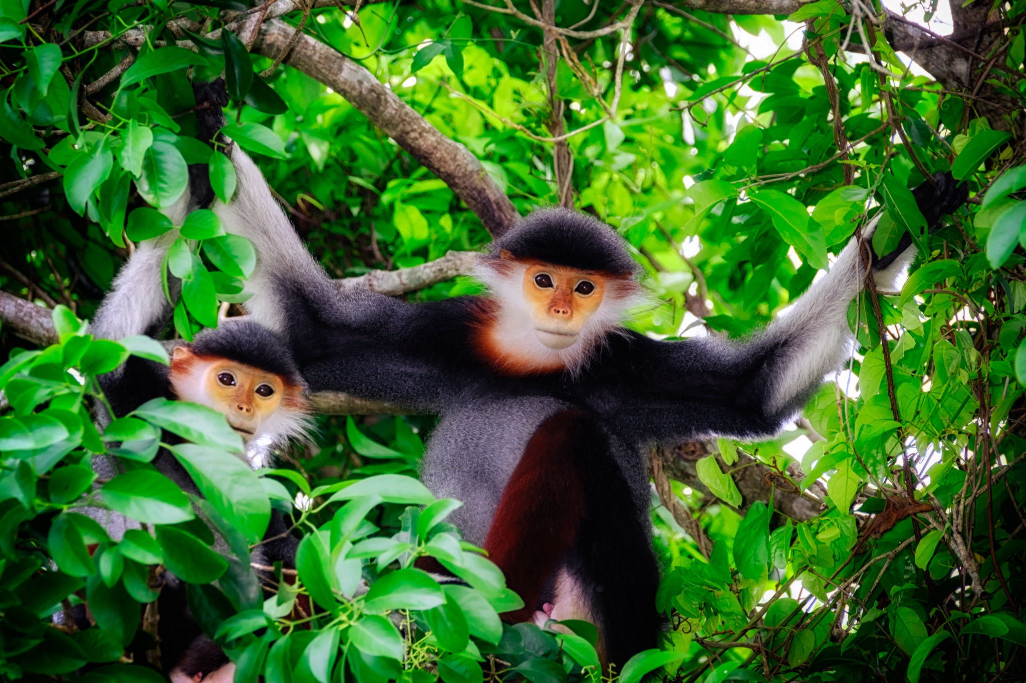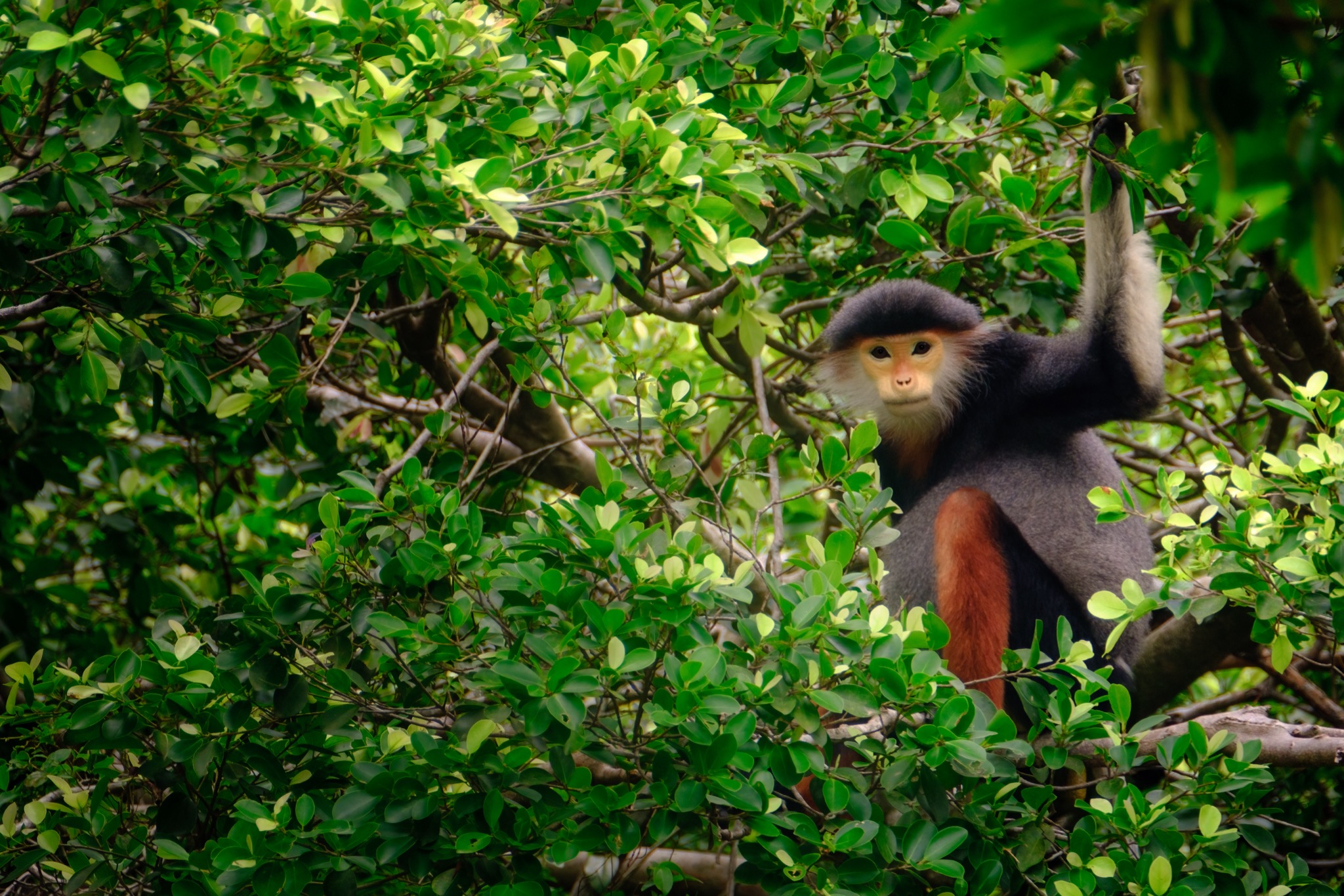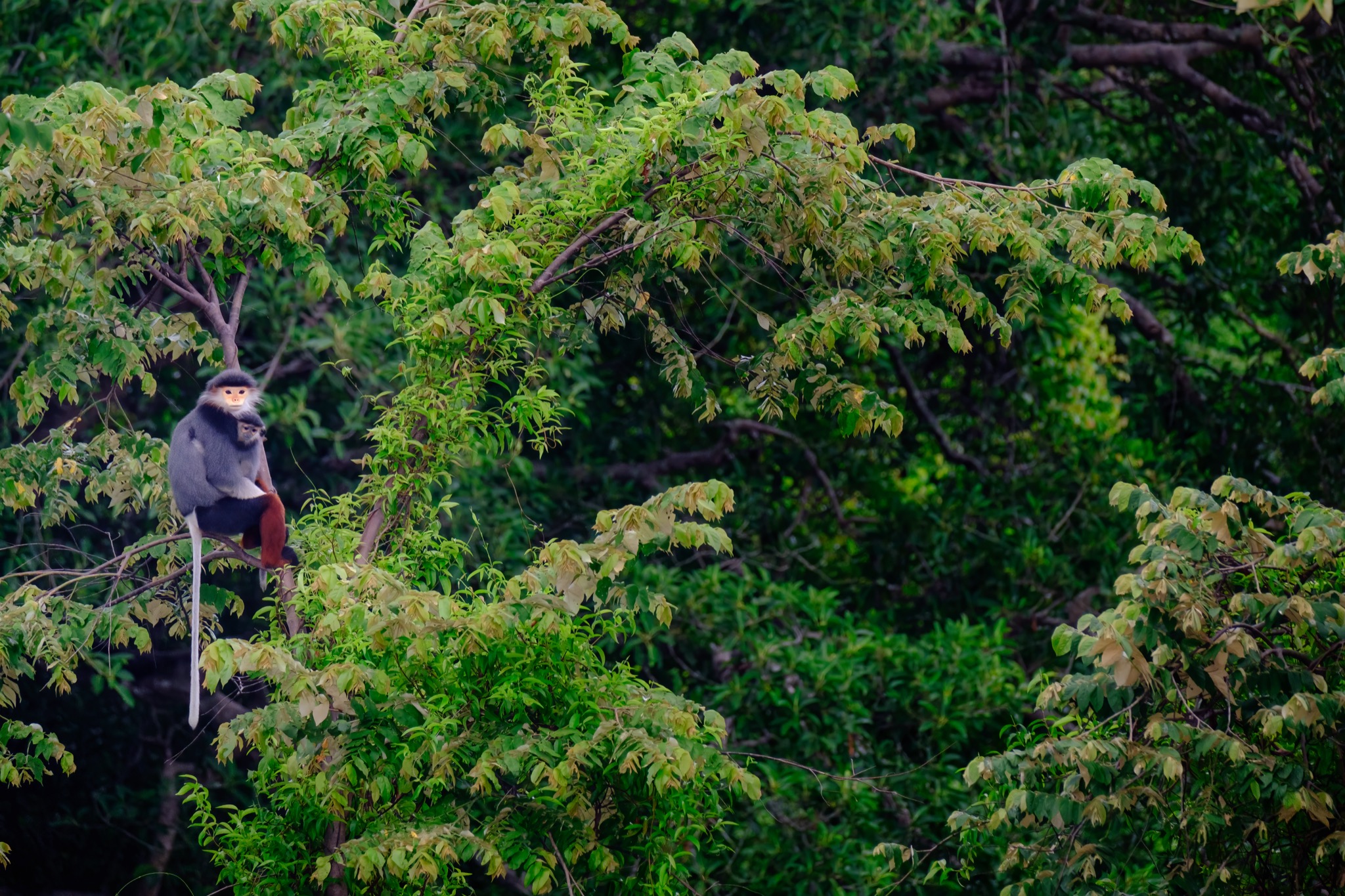 Il nostro viaggio si svolge nella foresta di Son Tra, nel distretto di Da Nang a Est del Vietnam, dove queste meravigliose scimmie vivono in piccoli gruppi familiari formati mediamente da quattro a quindici esemplari; anche se sono stati rilevati branchi composti da più di cinquanta unità. Infatti, come la gran parte dei primati, anche il Duca dal collo rosso è un animale sociale.