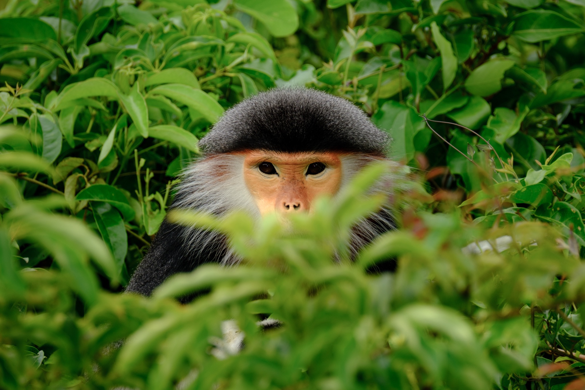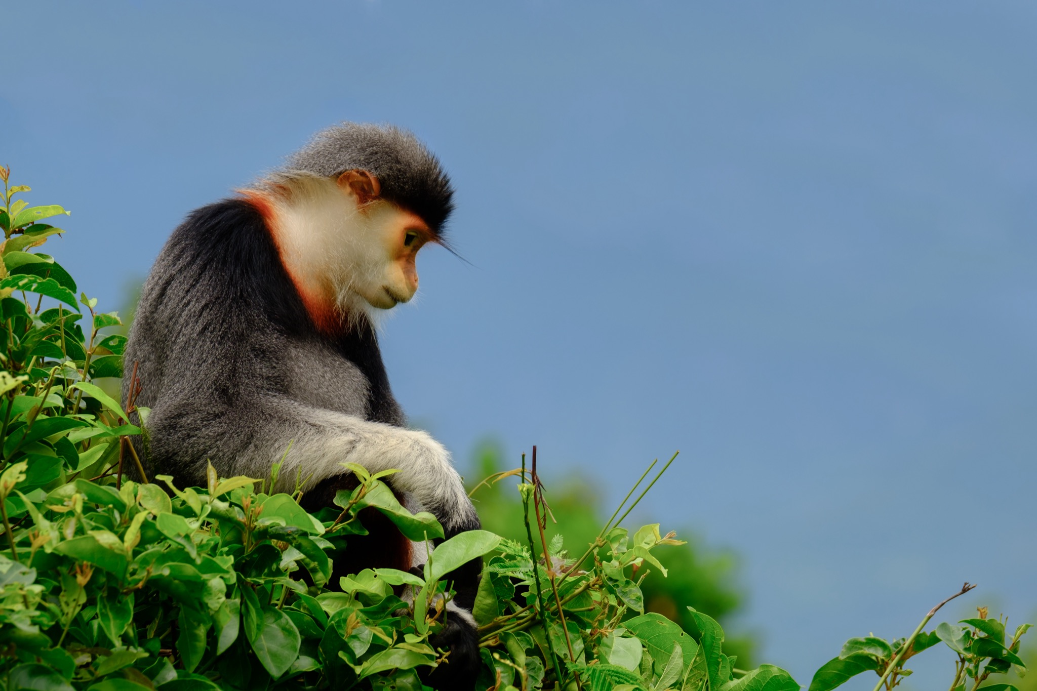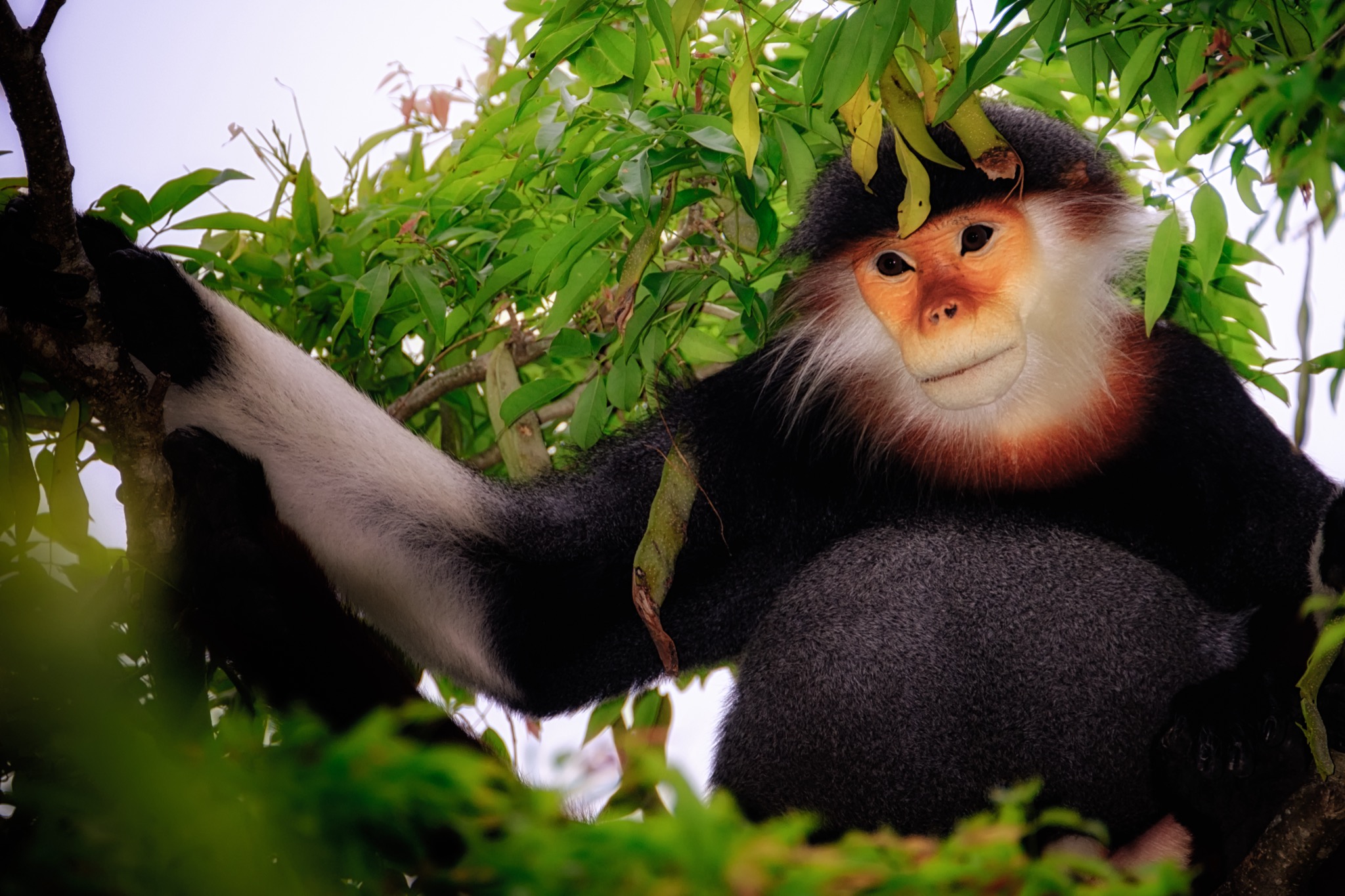 Il nostro viaggio si svolge nella foresta di Son Tra, nel distretto di Da Nang a Est del Vietnam, dove queste meravigliose scimmie vivono in piccoli gruppi familiari formati mediamente da quattro a quindici esemplari; anche se sono stati rilevati branchi composti da più di cinquanta unità. Infatti, come la gran parte dei primati, anche il Duca dal collo rosso è un animale sociale.