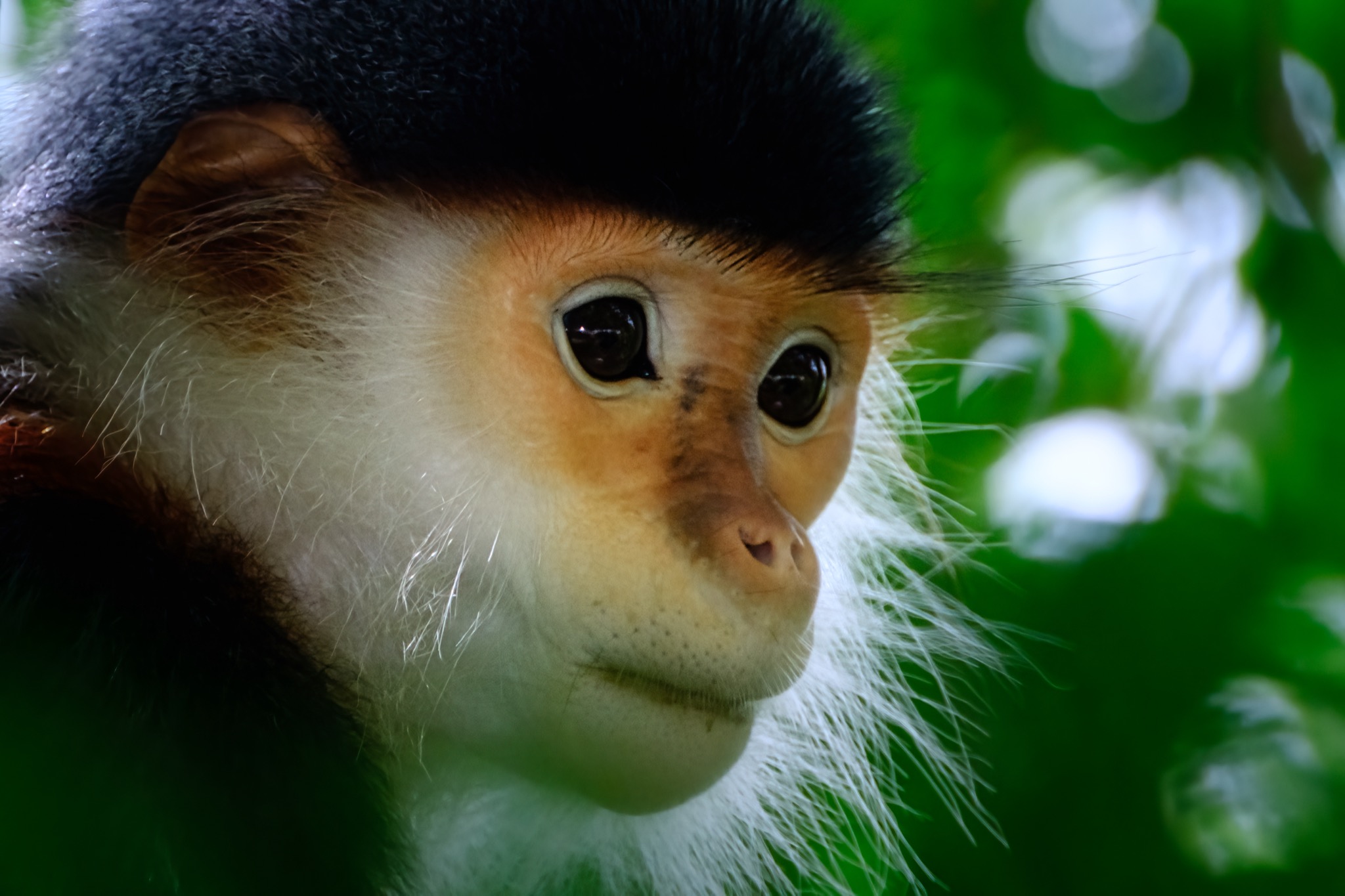 Questo primate è davvero unico per colori e forme, tanto che in lingua vietnamita viene chiamato “scimmia dai cinque colori”. Occhi grandi, scuri e intensi, incastonati in un musetto giallo oro, incorniciato da una cascata di peli bianchi che sembrano essere stati acconciati per un’occasione speciale.
