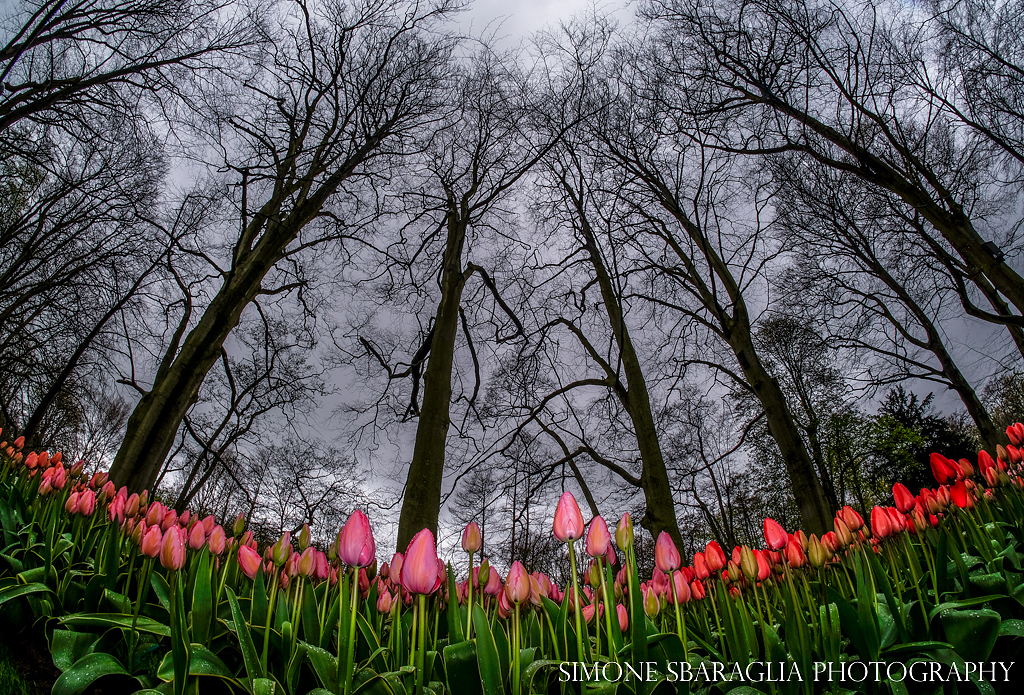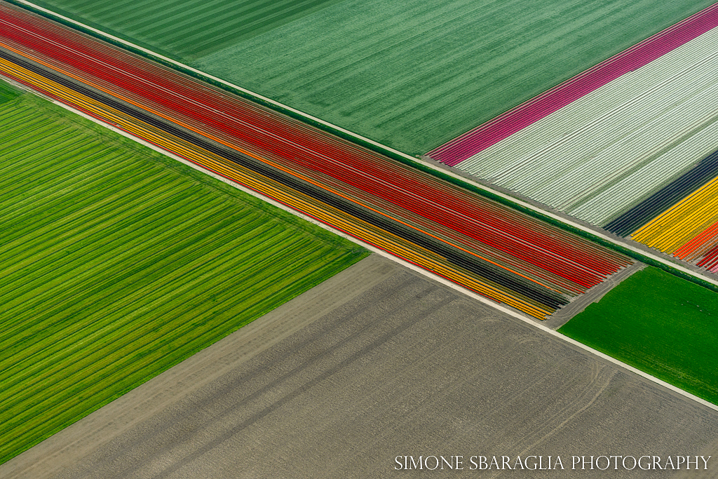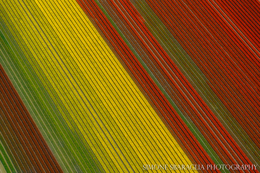 La perfezione geometrica dei filari dei tulipani piantati uno vicino all’altro, l’armonia dei colori e delle forme ha permesso al fotografo di catturare l'essenza dei questo fiore.