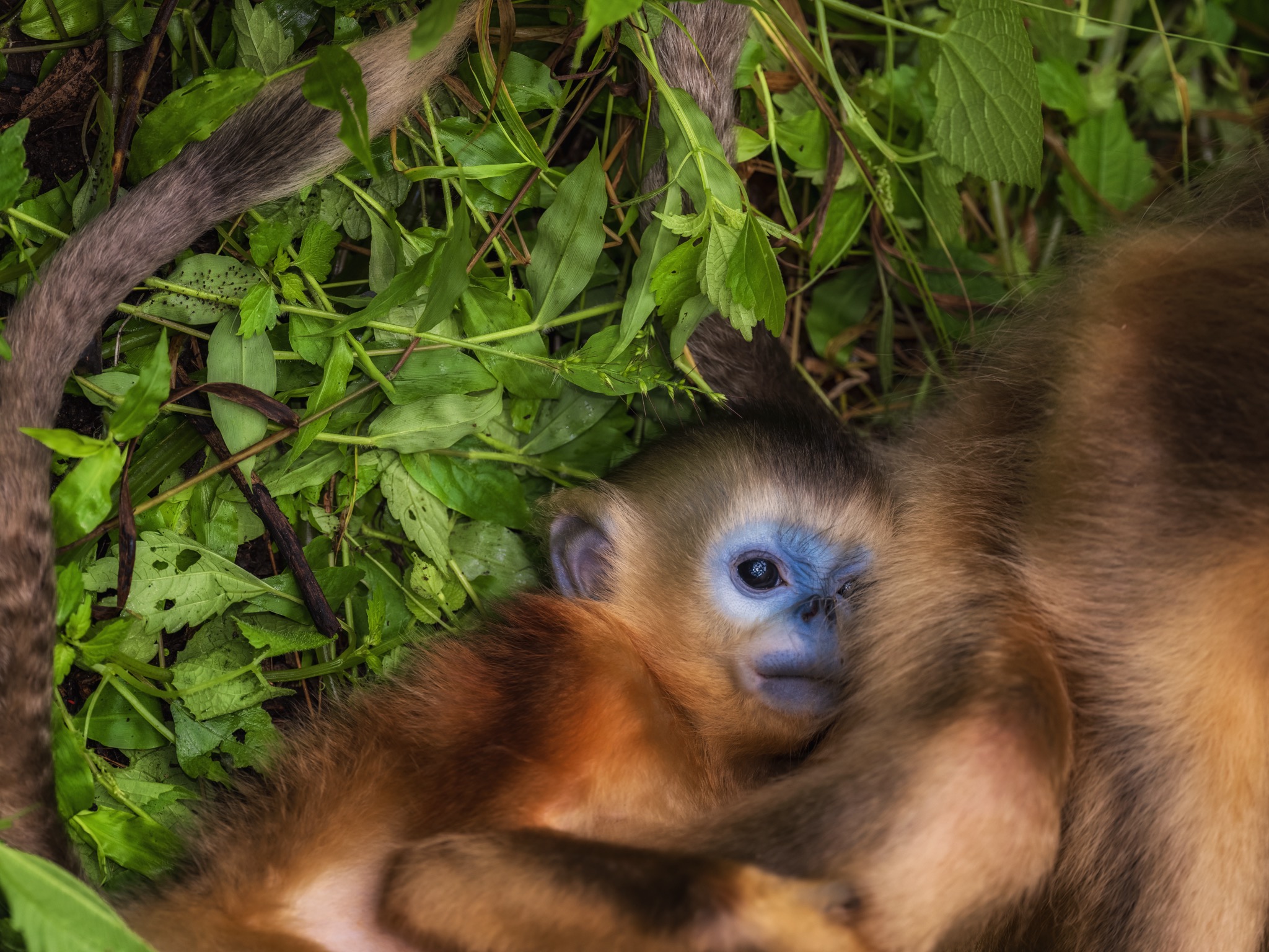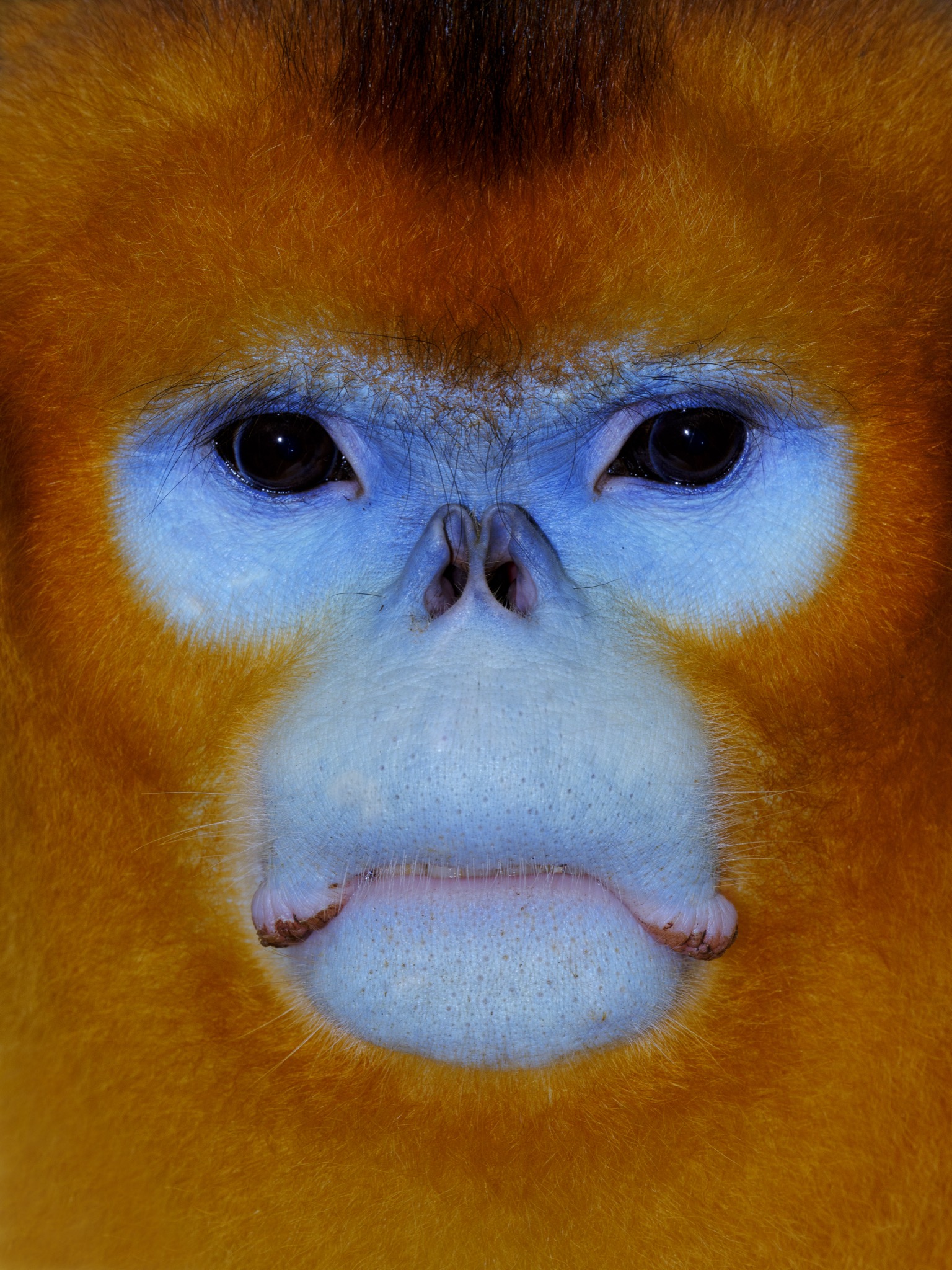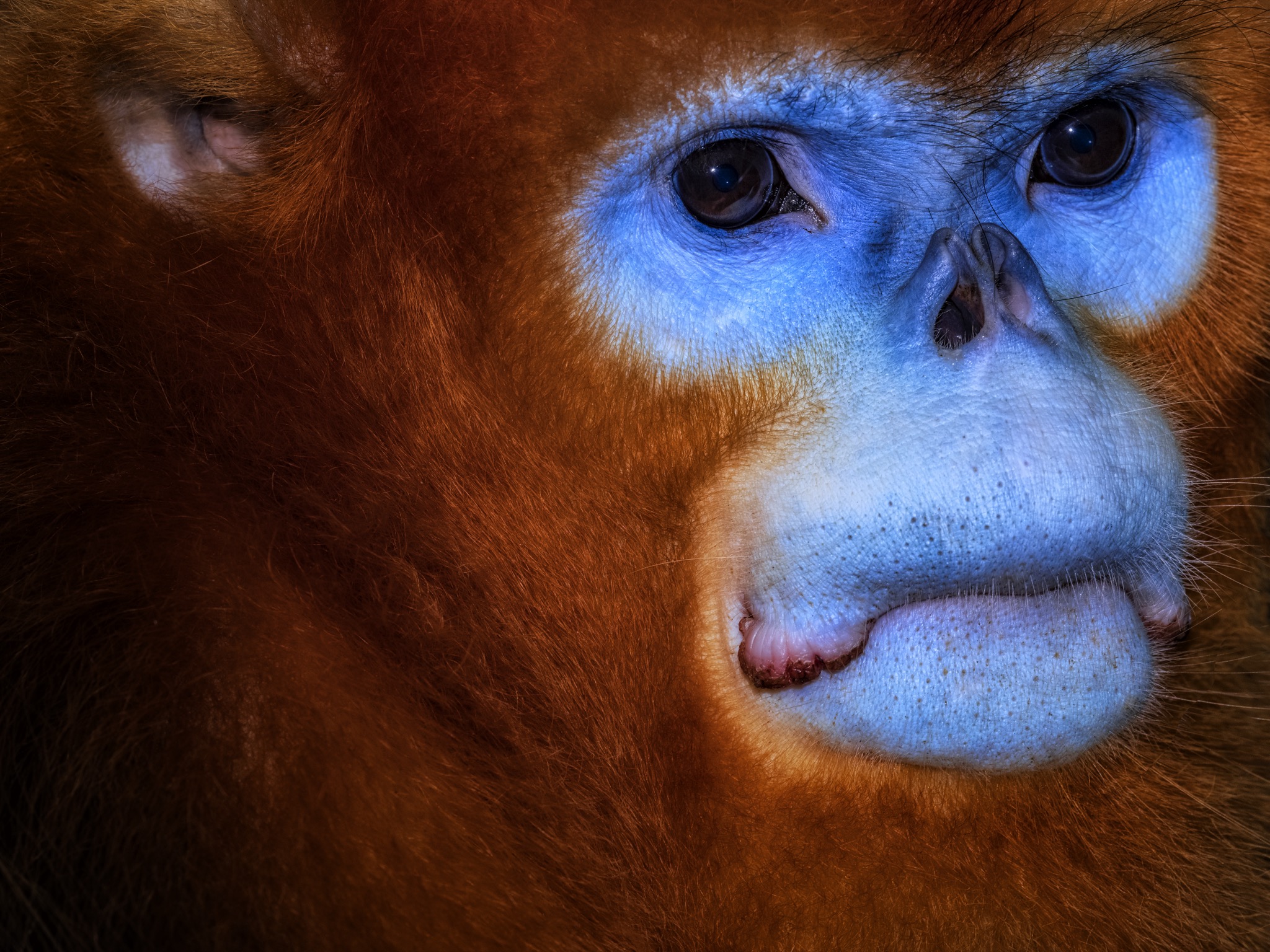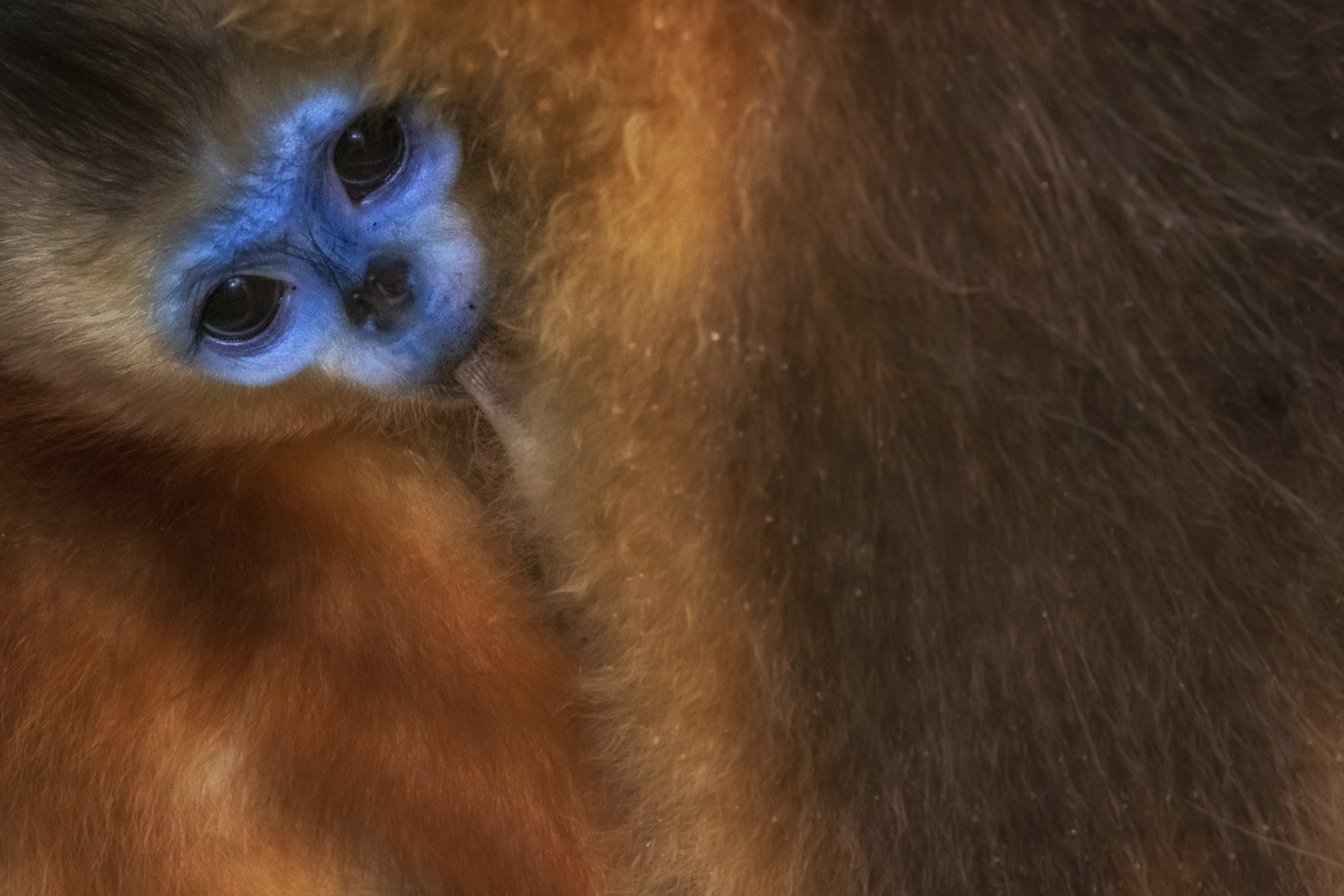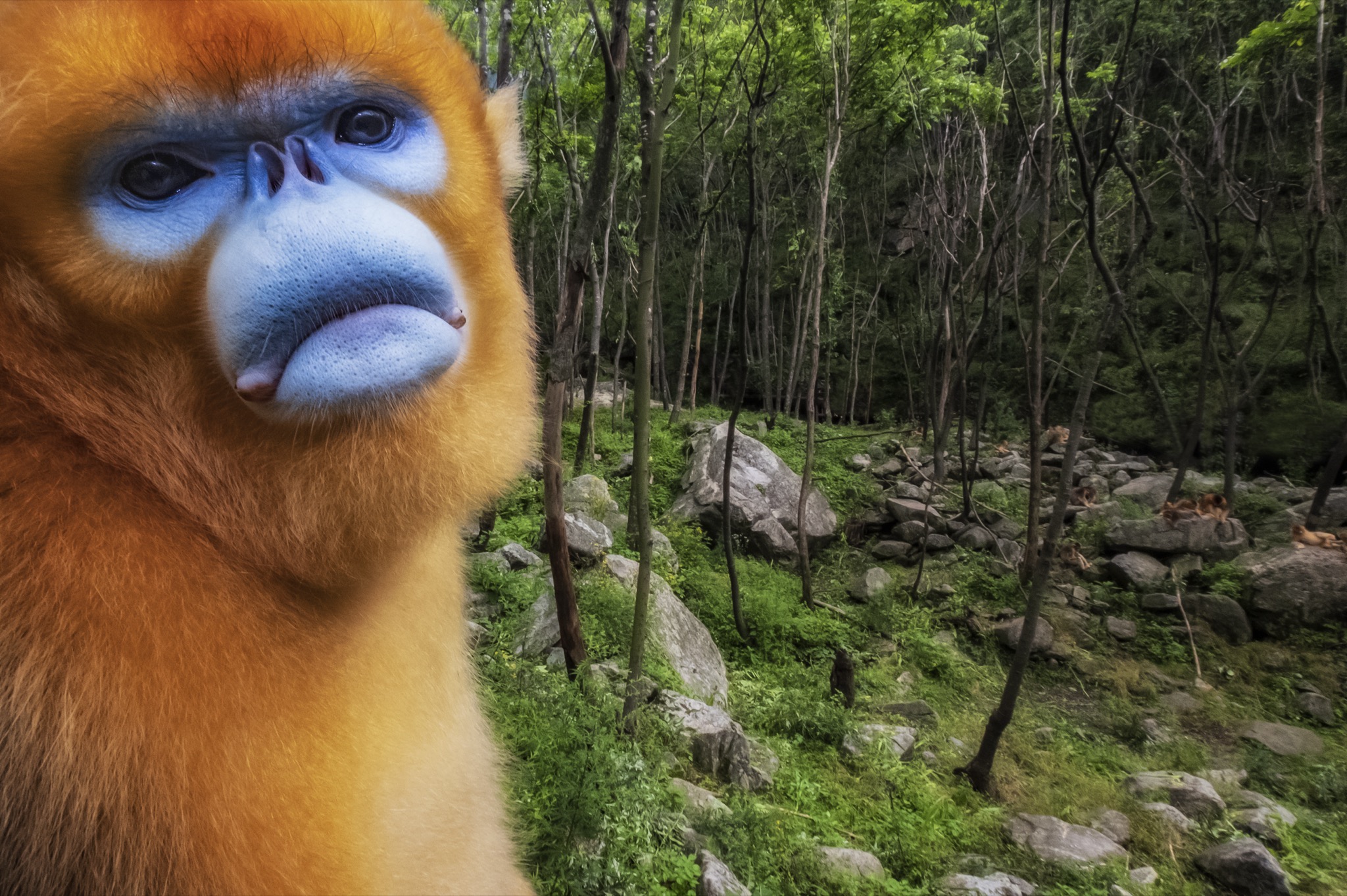La sua faccia e’ blu con il naso appiattito, le narici sono due piccoli buchi rivolti in avanti, il manto è ramato tendente all’oro e la coda lunga e pelosa. È il rinopiteco dorato (Rhinopithecus roxellana), una specie di piccole scimmie che vive in Cina nei boschi di montagna, nelle province centro-occidentali del Gansu, Hubei, Shaanxi e del Sichuan