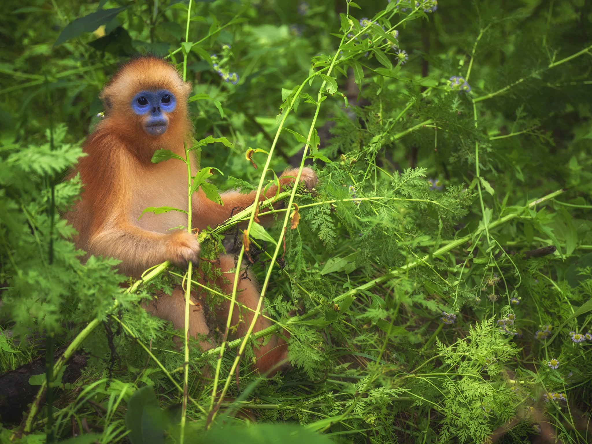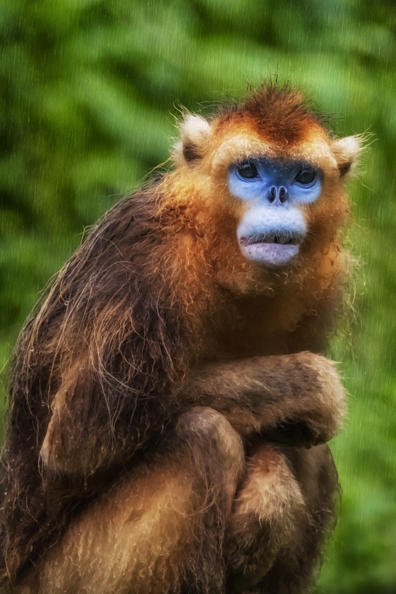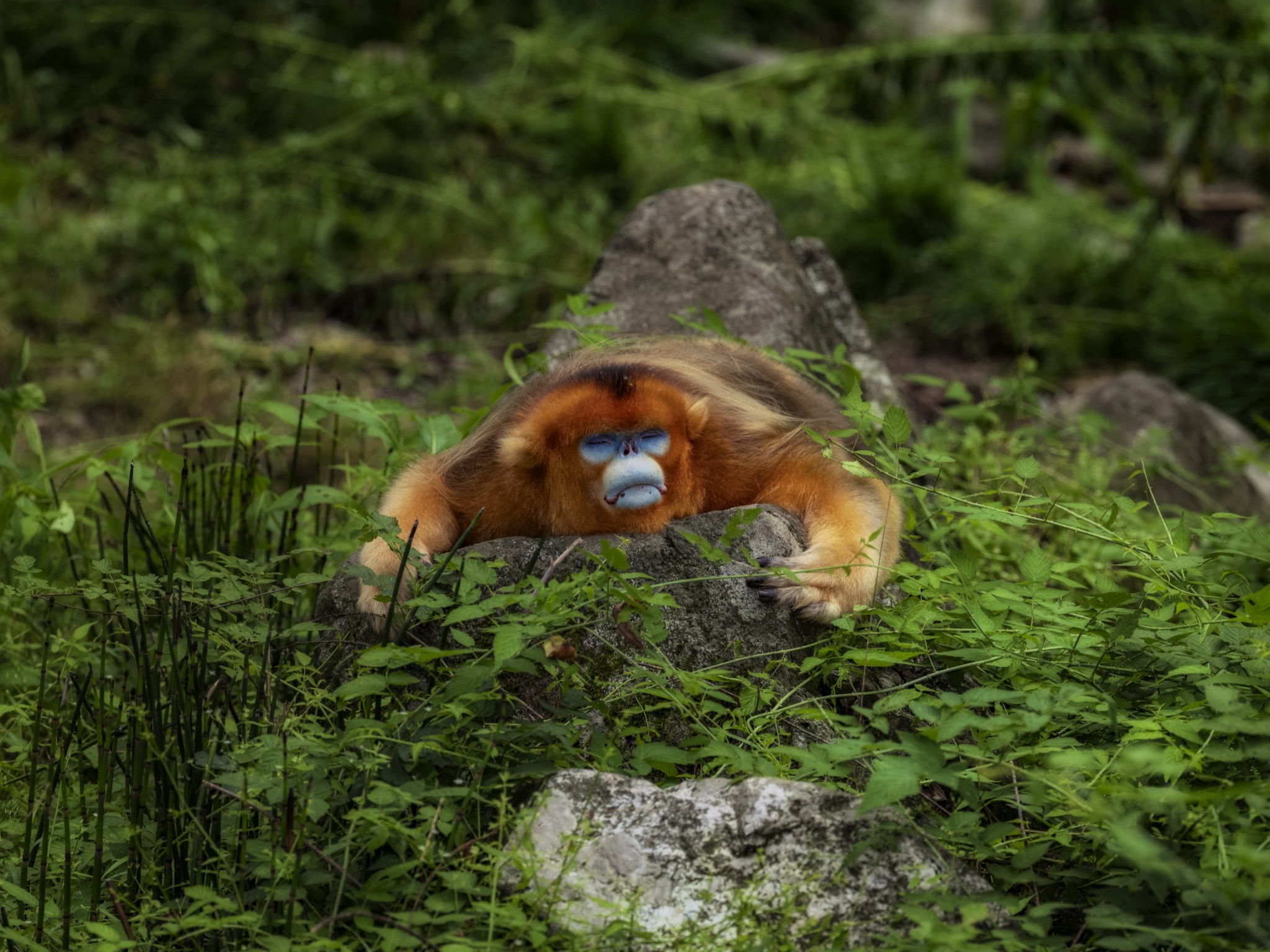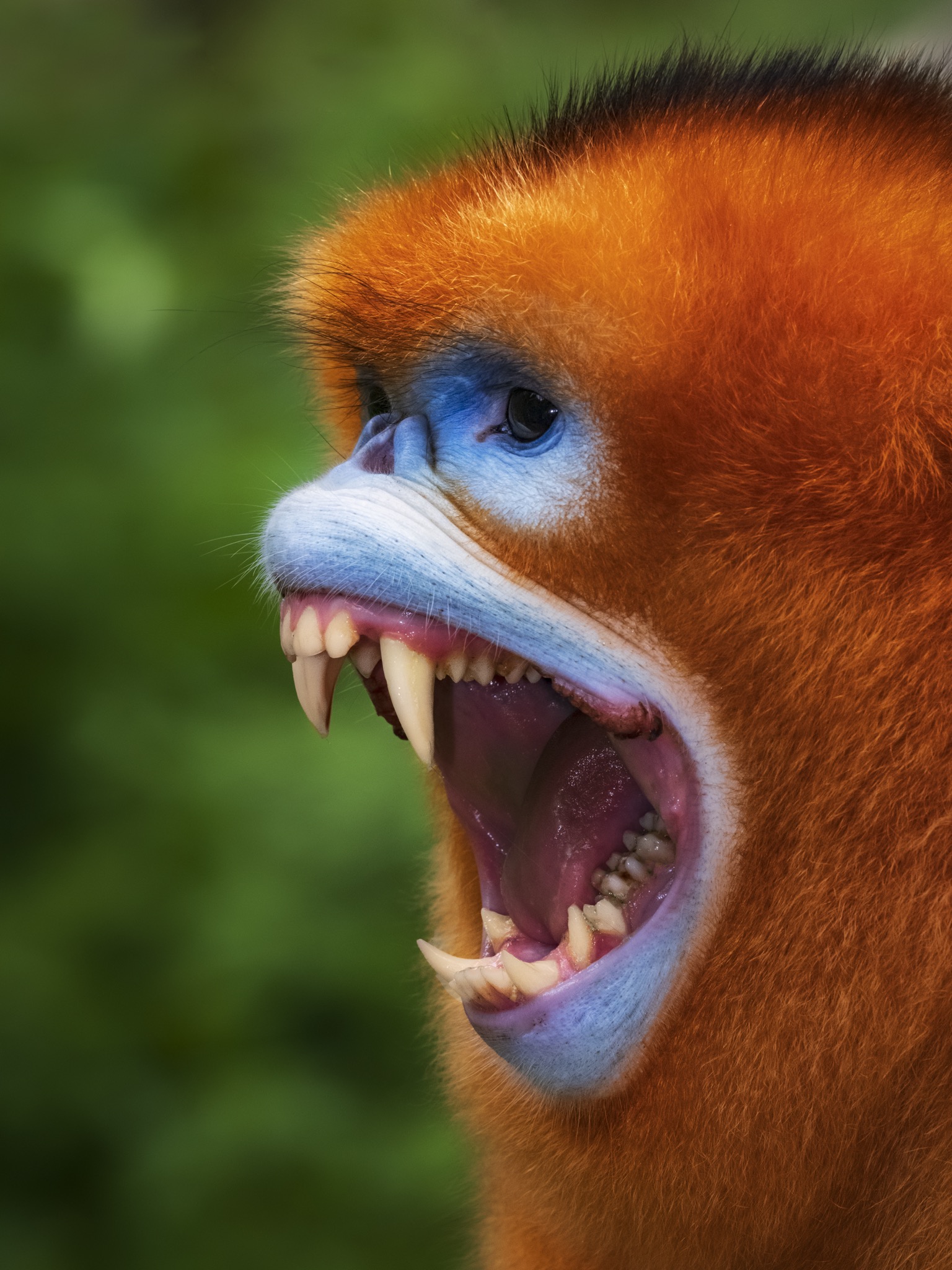 La sua faccia e’ blu con il naso appiattito, le narici sono due piccoli buchi rivolti in avanti, il manto è ramato tendente all’oro e la coda lunga e pelosa. È il rinopiteco dorato (Rhinopithecus roxellana), una specie di piccole scimmie che vive in Cina nei boschi di montagna, nelle province centro-occidentali del Gansu, Hubei, Shaanxi e del Sichuan