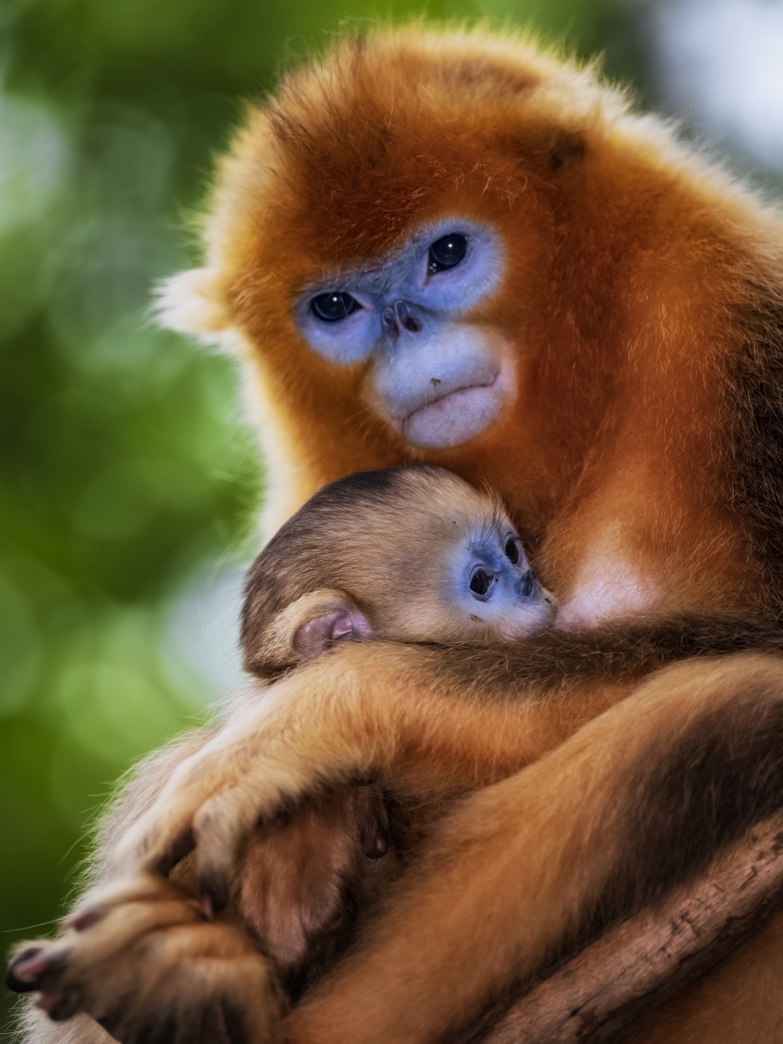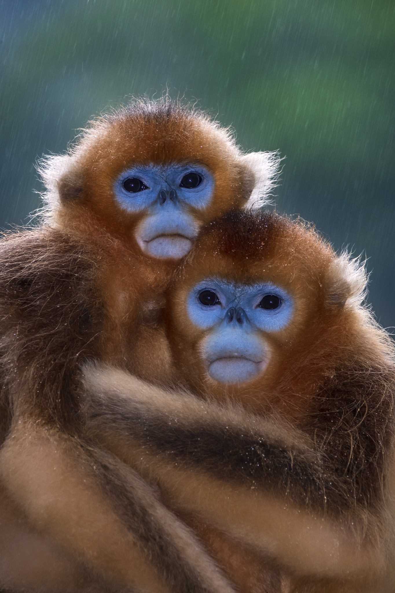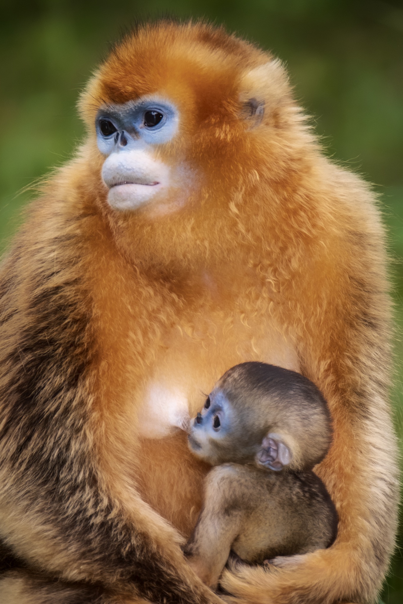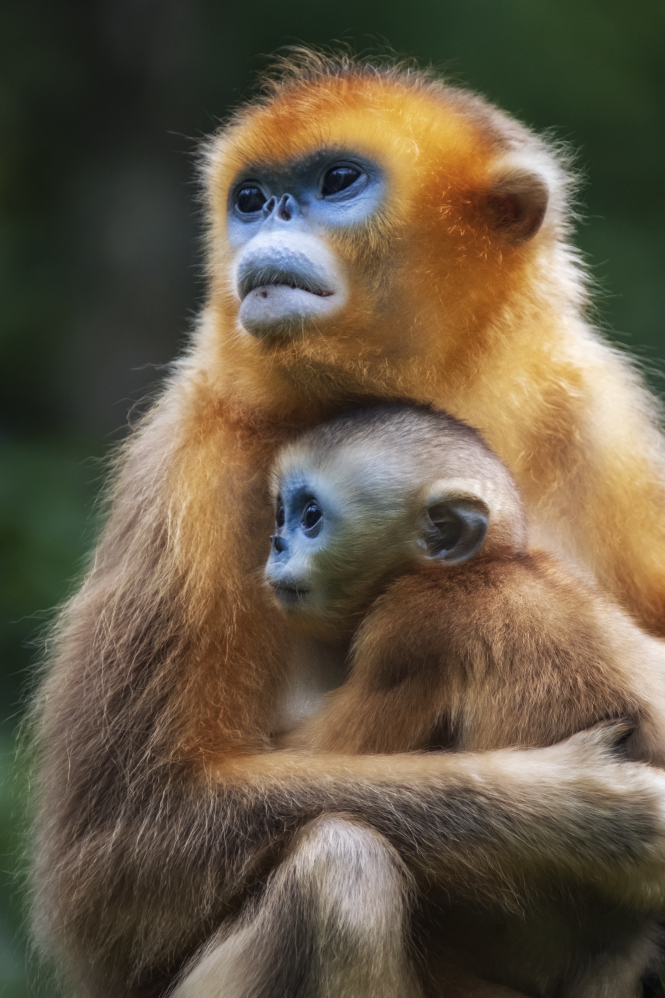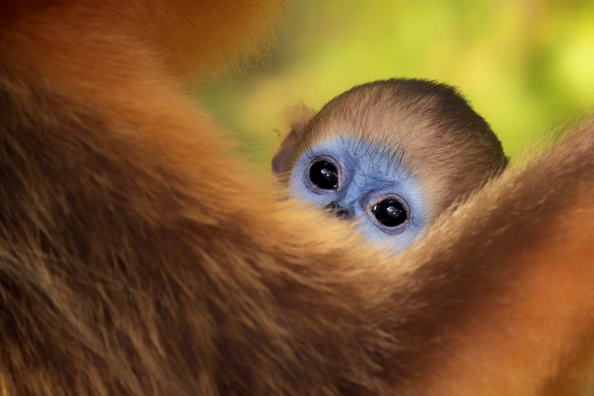 La sua faccia e’ blu con il naso appiattito, le narici sono due piccoli buchi rivolti in avanti, il manto è ramato tendente all’oro e la coda lunga e pelosa. È il rinopiteco dorato (Rhinopithecus roxellana), una specie di piccole scimmie che vive in Cina nei boschi di montagna, nelle province centro-occidentali del Gansu, Hubei, Shaanxi e del Sichuan