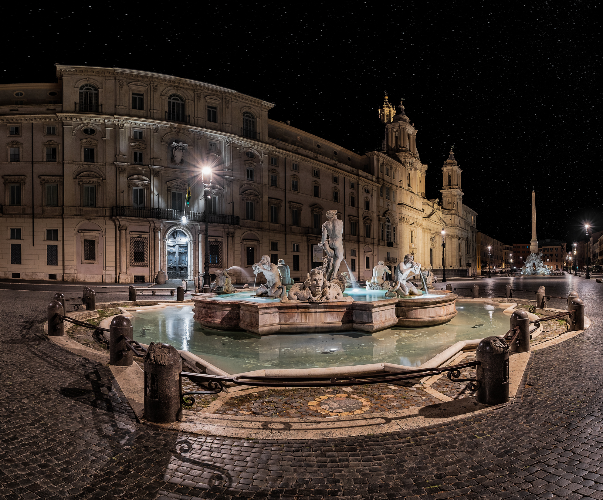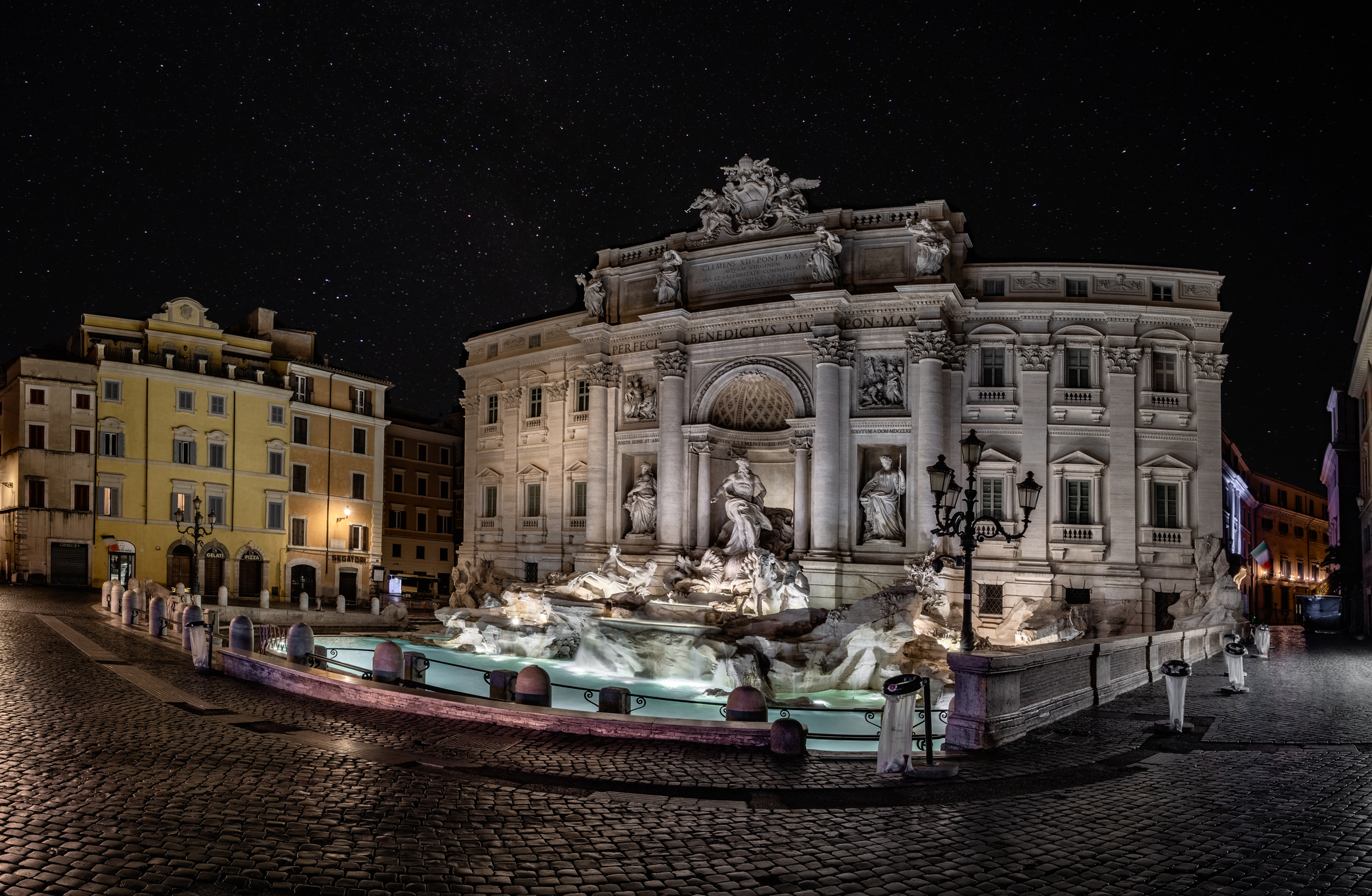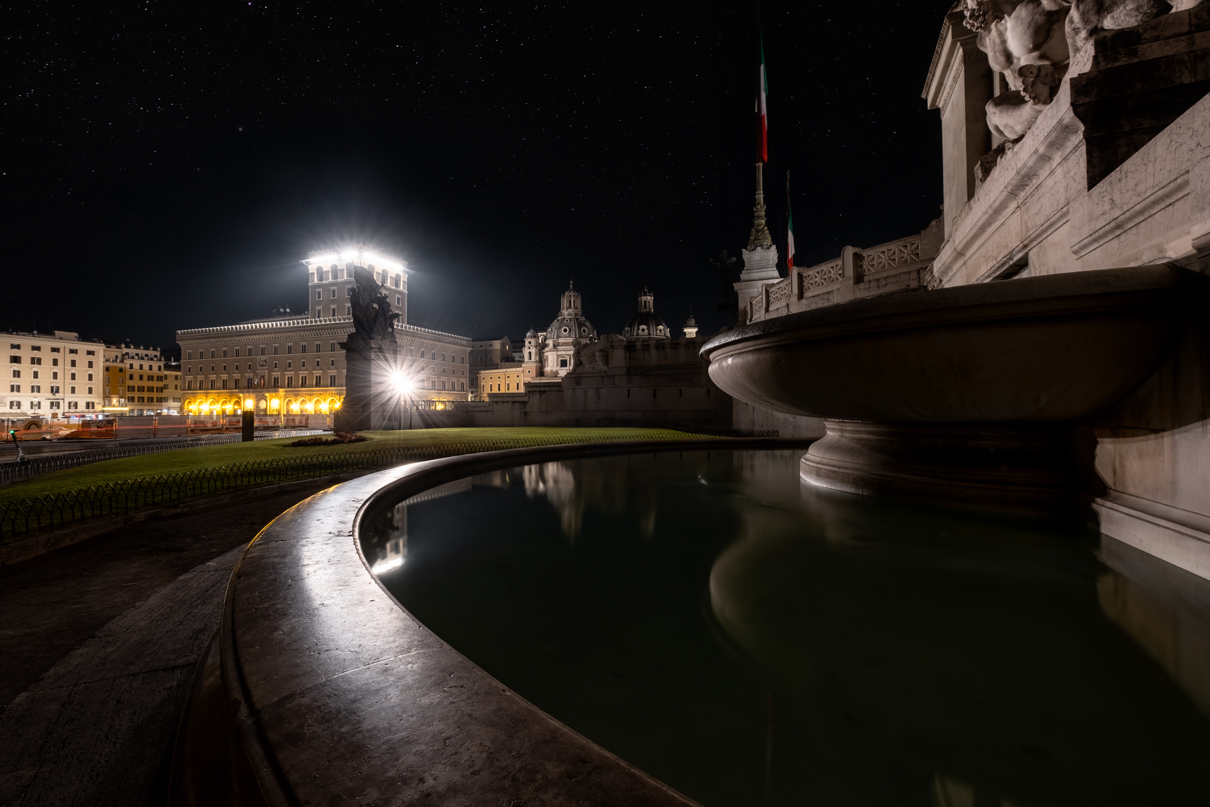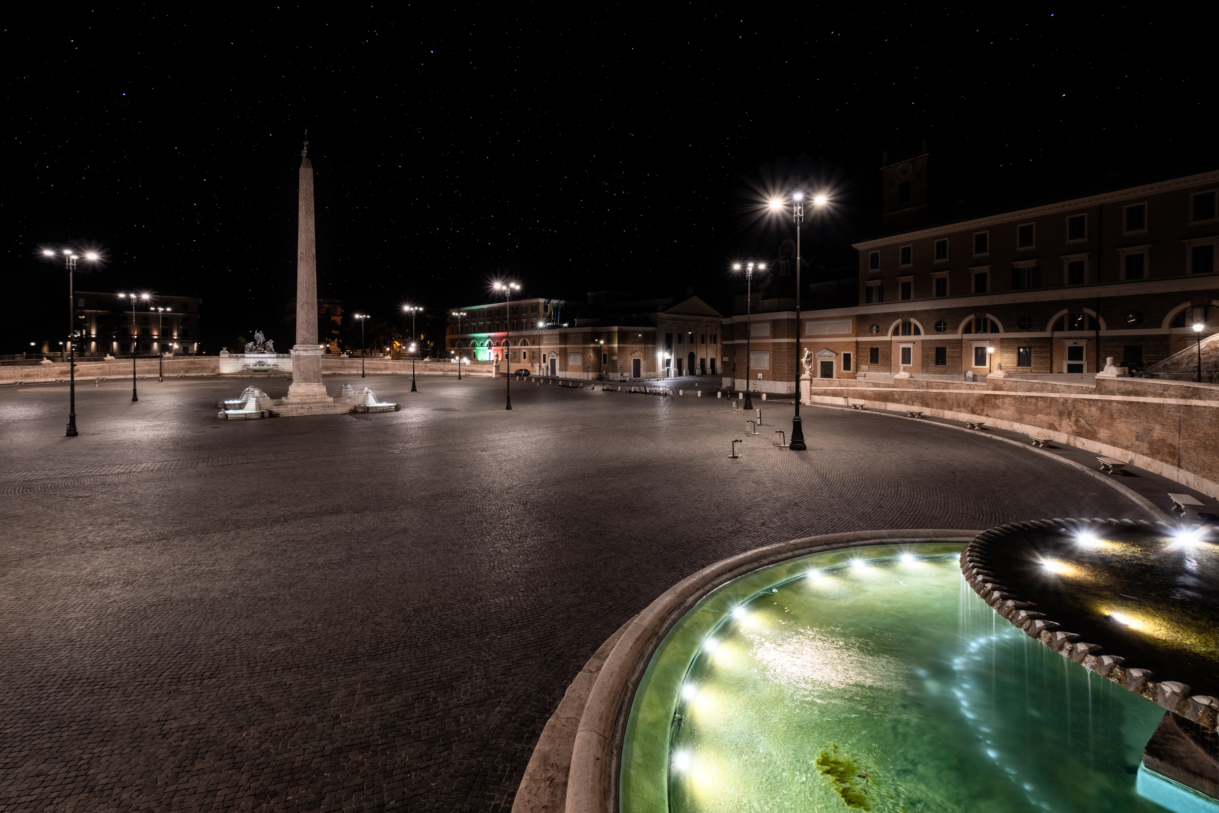 L’approccio che ho seguito è stato di pianificare molto accuratamente i luoghi in cui realizzare le immagini. Come mio solito ogni sessione fotografica è stata preceduta da una lunga fase di studio delle immagini satellitari, per definire il posto migliore in cui piazzare il treppiedi. In alcuni casi è stato necessario un sopralluogo diurno, per identificare esattamente l’inquadratura. Non amo girare a caso cercando spunti fotografici, non fa parte del mio modo di lavorare. Al contrario preferisco pianificare ogni dettaglio ed andare a realizzare l’immagine solo quando è tutto chiaro nella mia mente. La fase di realizzazione degli scatti è stata quindi molto rapida: nella maggior parte dei casi mi sono limitato a recarmi nel luogo accuratamente scelto e realizzare un singolo bracketing da 5 scatti (talvolta 7) con una differenza di uno stop di esposizione tra uno e l’altro, per assicurarmi di catturare l’intera gamma dinamica della scena. Ho cercato di lavorare molto rapidamente, anche perché non è sempre consentito utilizzare il treppiedi. Lo scatto della Fontana di Trevi, ad esempio, ha richiesto molti tentativi perché ogni volta mi veniva chiesto di non utilizzare il treppiedi a meno che non mi fossi procurato un’autorizzazione all’occupazione del suolo pubblico (purtroppo questo è quanto prevede la normativa