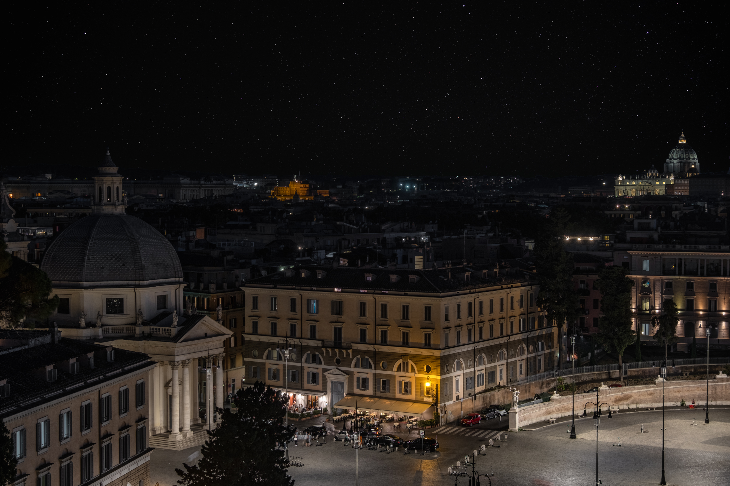 Per comunicare l’atmosfera quasi magica che vivevo decisi di immaginare le stelle. Immaginarle, perché a Roma notoriamente non si vedono. Tuttavia nella mia visione diventata quasi mistica, immaginavo la città notturna sotto il cielo stellato, con i suoi monumenti magnifici esposti per il piacere degli astri e non di milioni di turisti ammassati dietro le transenne.